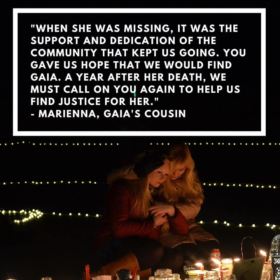 Marienna Pope-Weidemann, Gaia’s cousin, says: “When she was missing, it was the support and dedication from the public that kept us going. You gave us hope that we would find Gaia. A year after her death, we must call on you again to help us find justice for her. We can’t do this without you. If you know anything that might aid the investigation into Gaia’s rape case or the missing persons investigation and help us learn the truth, please come forward; not just for Gaia’s sake, but for the sake of anyone else who might be at risk.”