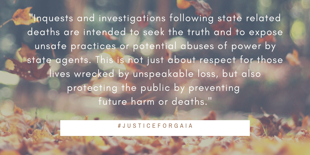 INQUEST has been working with the family of Gaia since January 2018. The family is represented by INQUEST Lawyers Group members Sarah Kellas and Harriet Wistrich of Birnberg Peirce Solicitors, and Caoilfhionn Gallagher QC of Doughty Street Chambers.