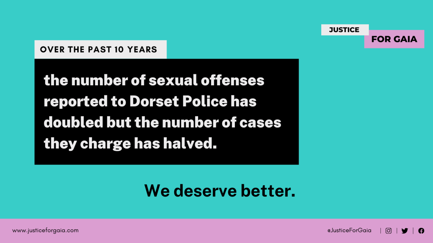 At the time that Gaia needed them, Dorset Police had the worst rape conviction rate in the country and it still has one of the worst. Over the past 10 years, the number of sex offenses reported to them has doubled – but the number of charges they bring has halved.