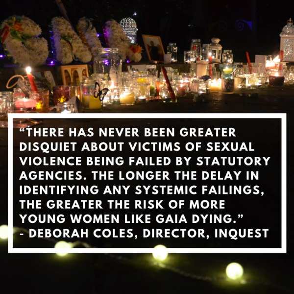 Deborah Coles, director of INQUEST, says: “Already one year on from Gaia’s disappearance, it is important that her family see a prompt and robust investigation. There has never been greater disquiet about victims of sexual violence being failed by statutory agencies. There is a clear link between the trauma of rape and mental ill health. The longer the delay in identifying any systemic failings, the greater the risk of more young women like Gaia dying.”